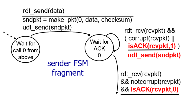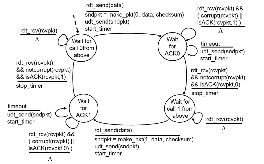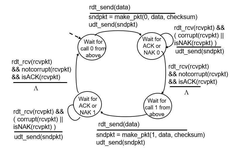 rdt_sender는 총 4가지 상태가 존재한다. 패킷을 만들고 시퀀스 0을 넣어서 전송하고, 상태를 전환한 뒤 ACK/NAK를 기다린다. 이후 rdt_receiver가 0번 패킷에 대한 ACK/NAK를 전송해 주고, ACK를 받으면 시퀀스 1을 넣은 새로운 패킷을 보내 주며, NAK를 받거나 오류가 있는 패킷이 들어온다면(corrupt 발생), 시퀀스 0을 넣은 기존 패킷을 보낸다. 따라서 0번 패킷을 보내기 전 상태, 0번 패킷을 보내고 ACK/NAK를 기다리는 상태, 1번 패킷을 보내기 전 상태, 1번 패킷을 보내고 ACK/NAK를 기다리는 상태 총 4가지 상태가 존재하게 된다.